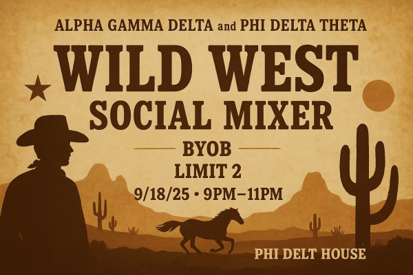 Alpha Gamma Delta and Phi Delta Theta are teaming up for a rootin’-tootin’ Wild West social! Dust off your cowboy hats, bandanas, and boots because we’re bringing the frontier fun…